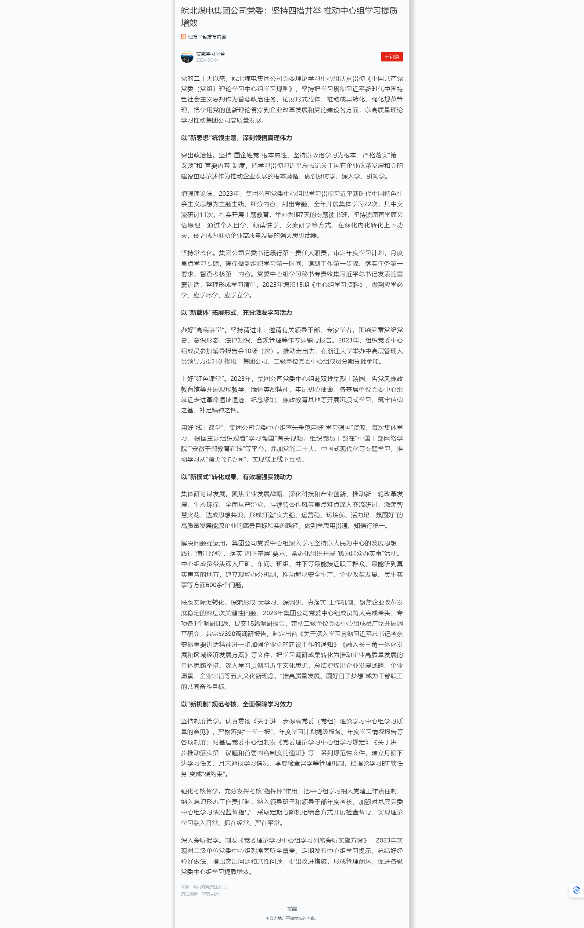 3月1日學(xué)習(xí)強(qiáng)國(guó)平臺(tái):皖北煤電集團(tuán)公司黨委:堅(jiān)持四措并舉 推動(dòng)中心組學(xué)習(xí)提質(zhì)增效